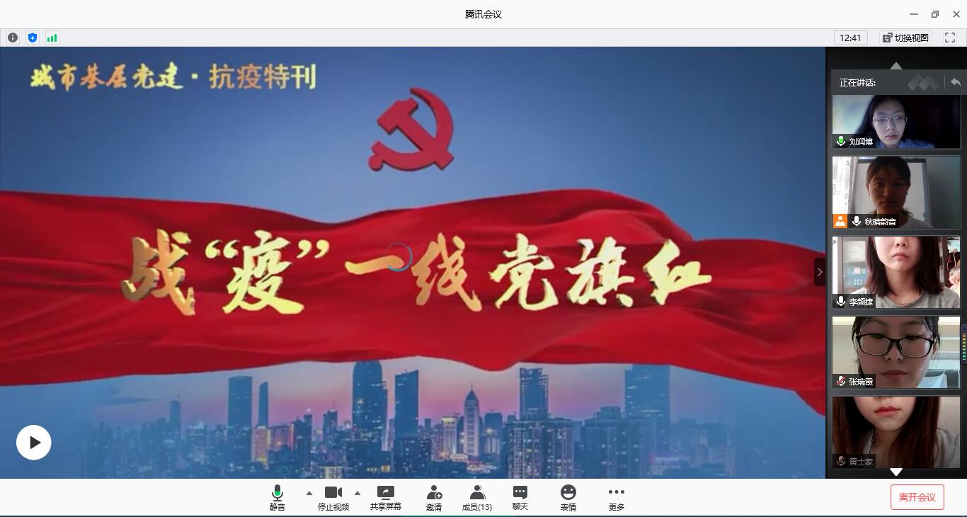 为扎实推进“牢记初新使命,争当出彩先锋”主题教育,不断升华理想信念,传承红色基因,牢记初心使命。6月28日下午,永利官网研究生党支部组织开展《战“疫”一线党旗红》线上观影学习交流活动,支部全体党员参与会议,会议由支部副书记李频捷主持。