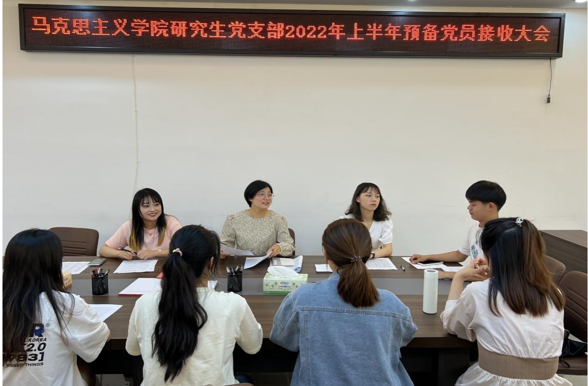 5月31日,永利官网研究生党支部于社科楼323会议室召开2022年上半年预备党员接收大会,讨论了余欢欢、张蒙蒙、赵子剑、赵婧同、陶小颍、郭婉如、 喻泳成、葛鸿萍八位同志转为中共预备党员的问题。会议由支部书记郑晨霞同志主持,彭燕担任监票人,王澳远担任计票人。