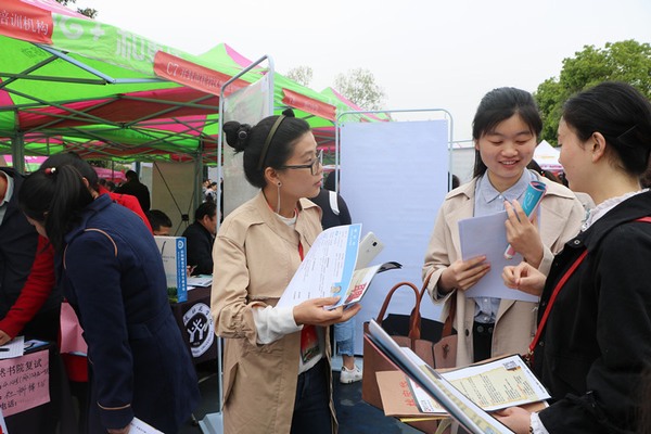 4月14日上午,河南省毕业生就业市场豫南地区分市场暨信阳师范学院2018届毕业生春季双选会在我校人文楼西篮球场举行,本次双选会由河南省教育厅主办,信阳师范学院、信阳市人力资源与社会保障局共同承办。永利官网院长杨云善、团委老师孙绪曙、曹菁菁到场了解企业用人情况、招聘情况。来自制药、教育、金融、文化、建筑、销售、信息技术等行业领域的二百余家企事业单位参加了招聘会,吸引了永利官网多名毕业生前来应聘。