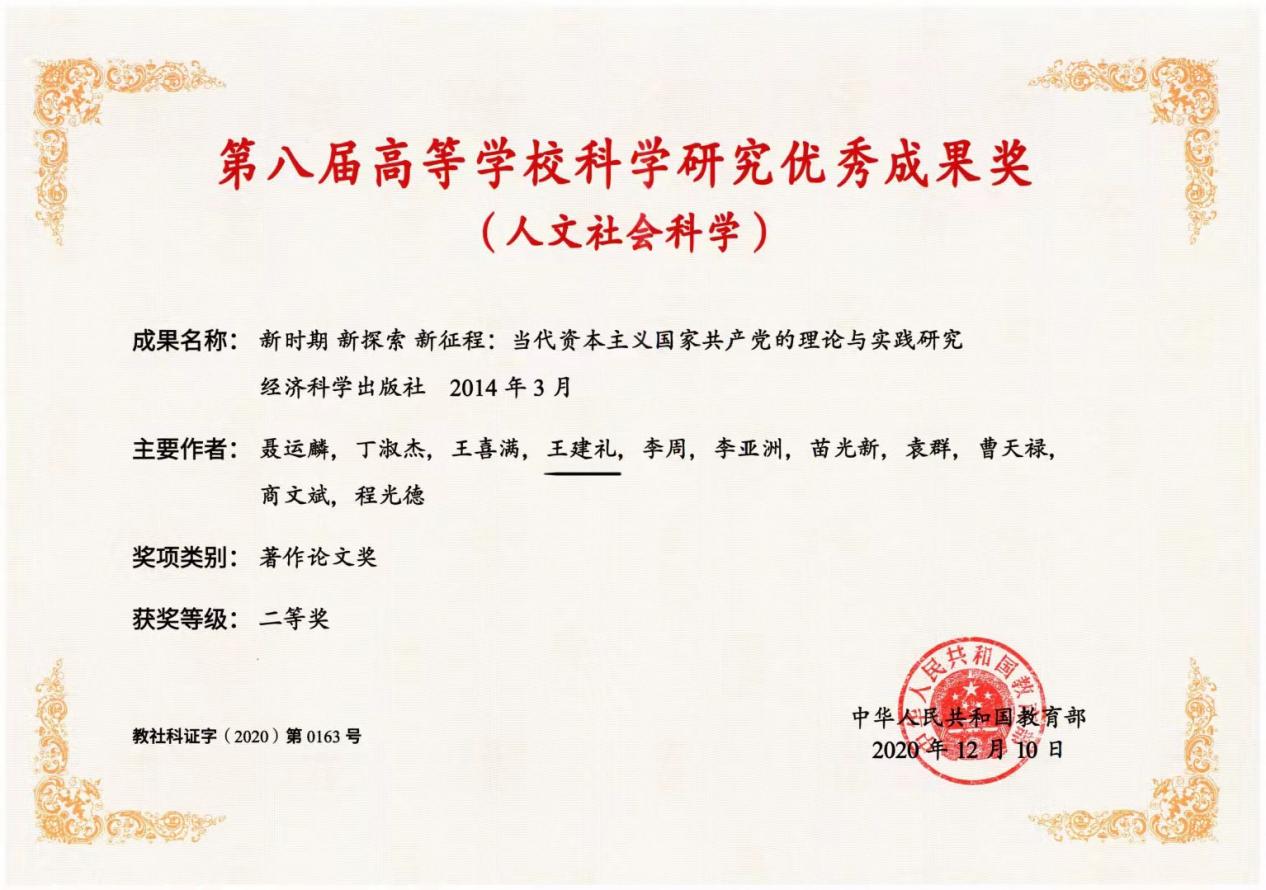 在教育部第八届高等学校科学研究优秀成果奖(人文社会科学)评选中,华中师范大学聂运麟教授等著、永利官网王建礼博士参与的著作《新时期新探索新征程:当代资本主义国家共产党的理论与实践研究》(经济科学出版社2014年版)荣获“著作论文奖类二等奖”。