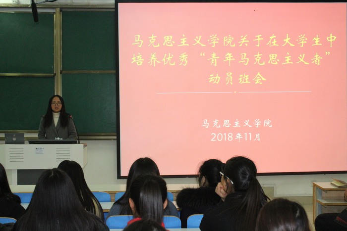 为培养优秀青年马克思主义者,坚定大学生马克思主义信仰,11月25日晚,77779193永利官网在社科楼514教室顺利开展关于在大学生中培养优秀“青年马克思主义者”动员班会。团委老师曹菁菁、河南省“青年马克思主义培养工程”学员史弘扬和永利官网2017、2018级全体同学共同参加本次班会。此次班会由曹菁菁主持。
