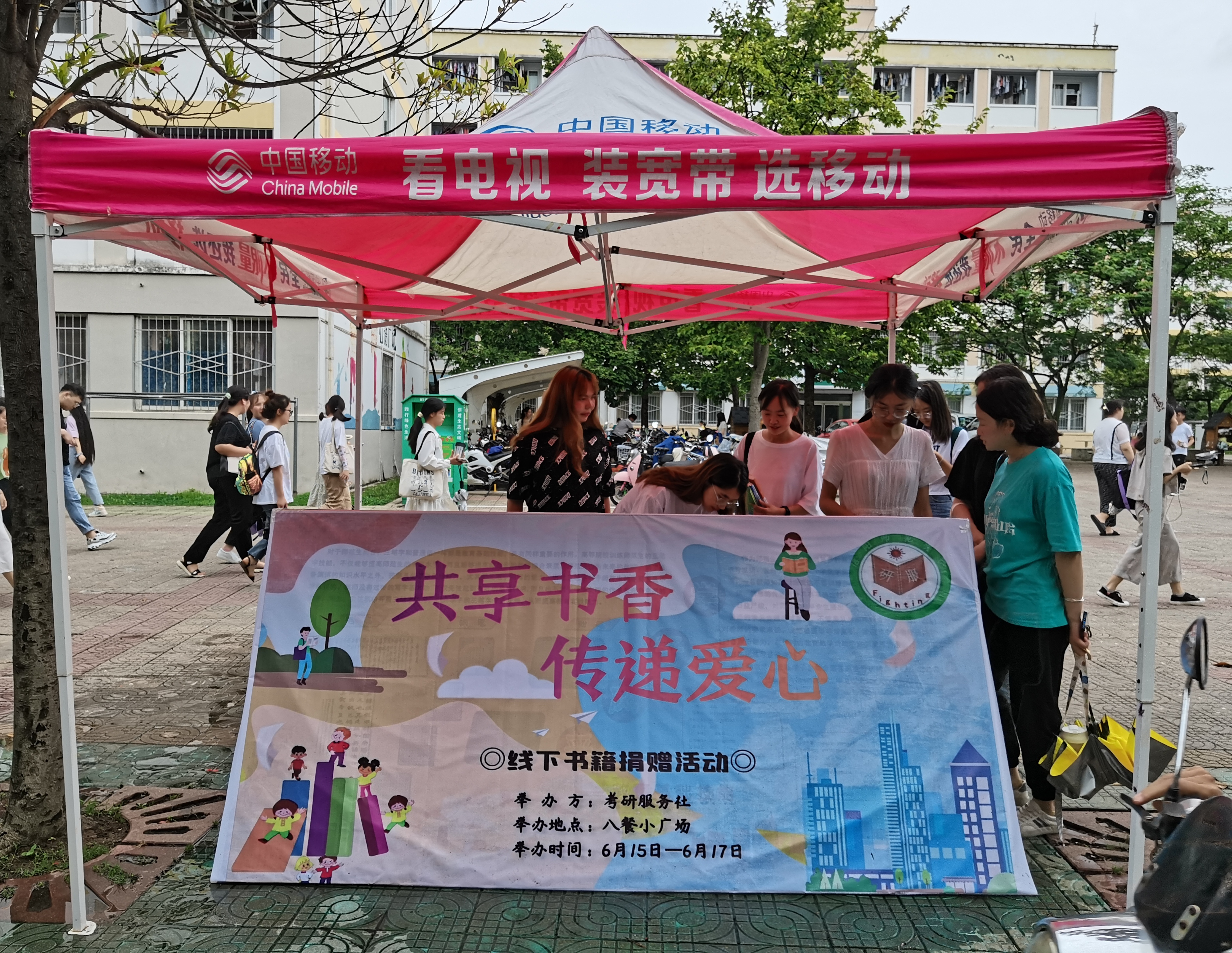 6月15日下午至6月17日中午,77779193永利官网考研服务社在八餐小广场开展了“共享书香,传递爱心”线下书籍捐赠活动。社团负责人及部落成员参加此次活动。