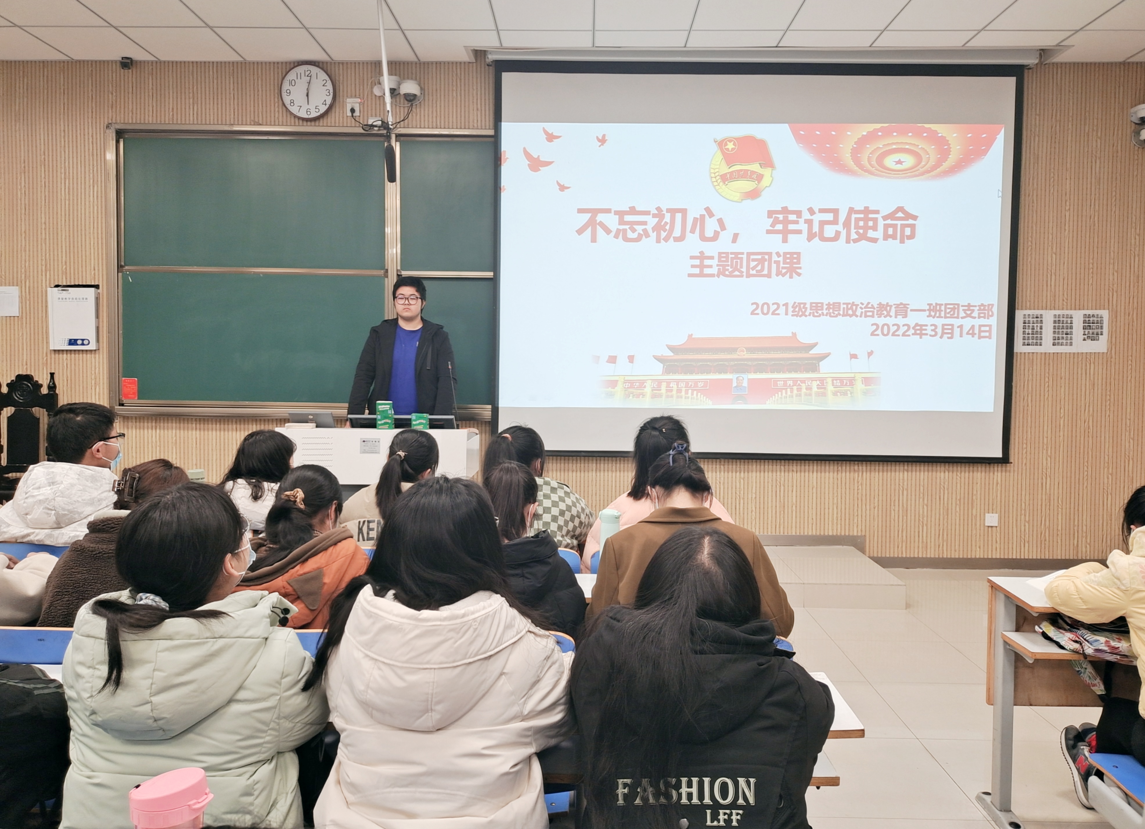 3月14日下午,77779193永利官网2021级思想政治教育一班在社科楼515开展“不忘初心,牢记使命”主题团课。2021级思想政治教育一班全体团员共同参加了本次会议。会议由团支书戴翰林主持。