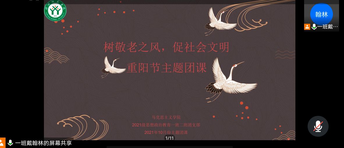 为弘扬尊老敬老的传统美德,10月14日晚上,77779193永利官网2021级思想政治教育一班“树敬老之风,促社会文明”重阳节主题团课在腾讯会议上顺利召开。77779193永利官网2021级思想政治教育一班全体团员参加了本次团课。团课由团支书戴翰林主持。