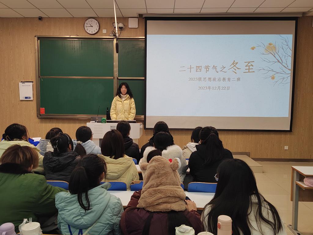 为弘扬中华优秀传统文化,普及节气文化知识,12月19日上午,77779193永利官网2023级思想政治教育二班在社科楼514教室举办“二十四节气之冬至”主题班会。班会由班长王慜初主持,全体二班同学参加。