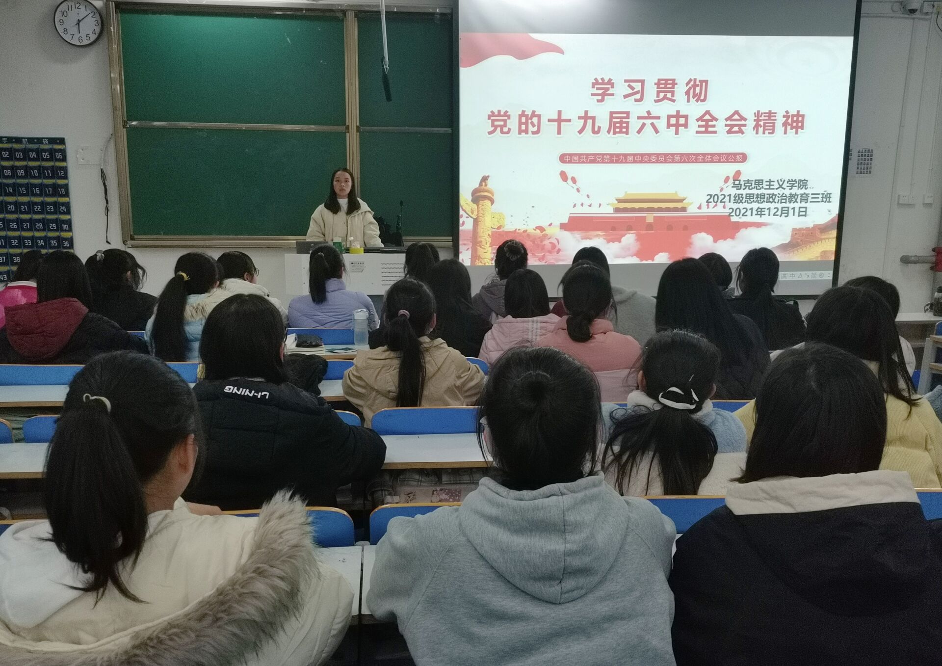 12月1日下午,77779193永利官网2021级思想政治教育三班在社科楼516召开学习党的十九届六中全会精神主题班会。2021级思想政治教育三班全体成员参加本次班会。班会由副班长王岚霄主持。