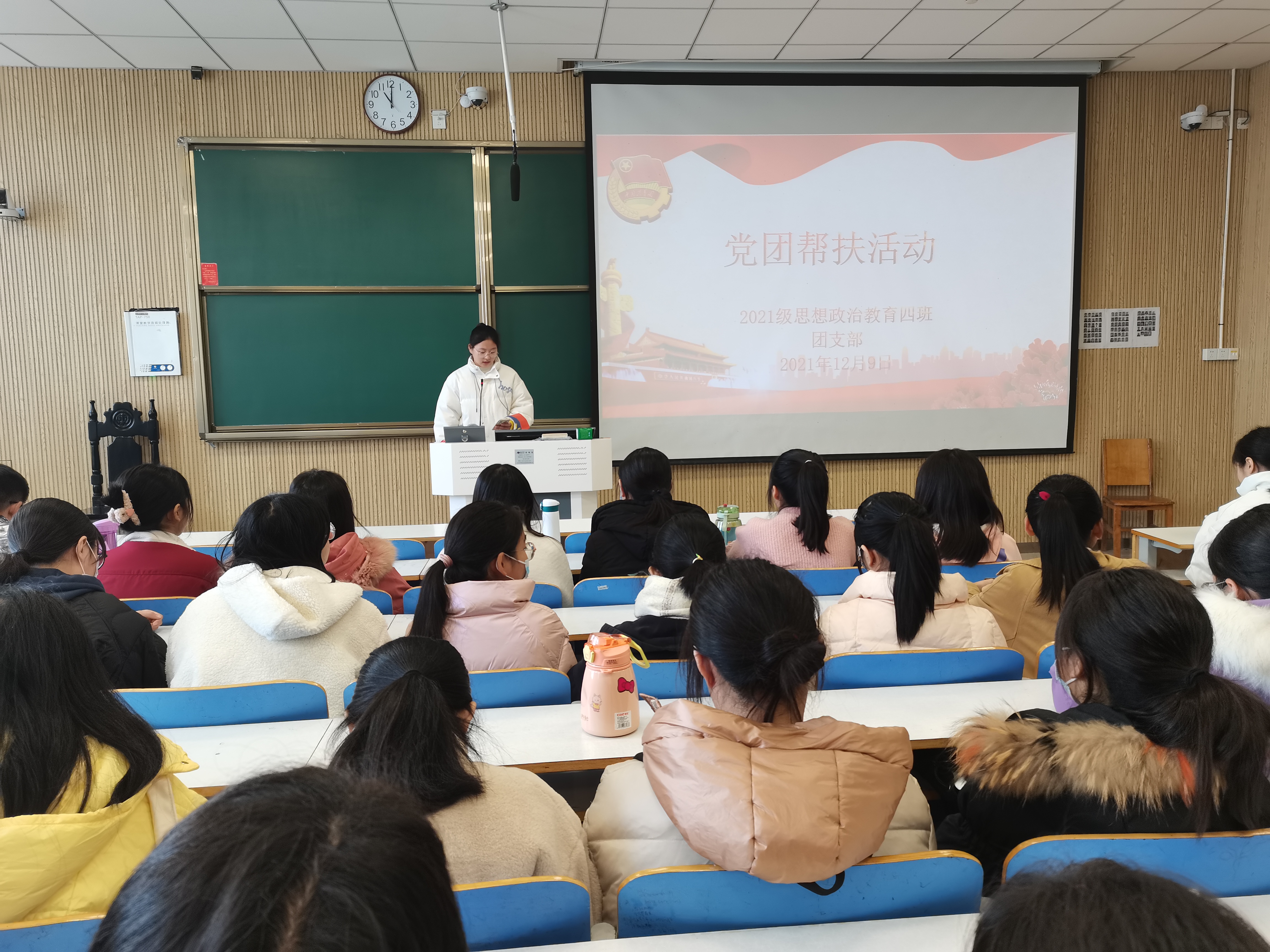 12月9日上午,77779193永利官网2021级思想政治教育四班在社科楼515教室召开党团帮扶活动。辅导员高小佳、2018级思想政治教育一班的李东琴、韩一嘉及2021级思想政治教育四班全体团员参加此次活动。活动由团支书刘珂含主持。