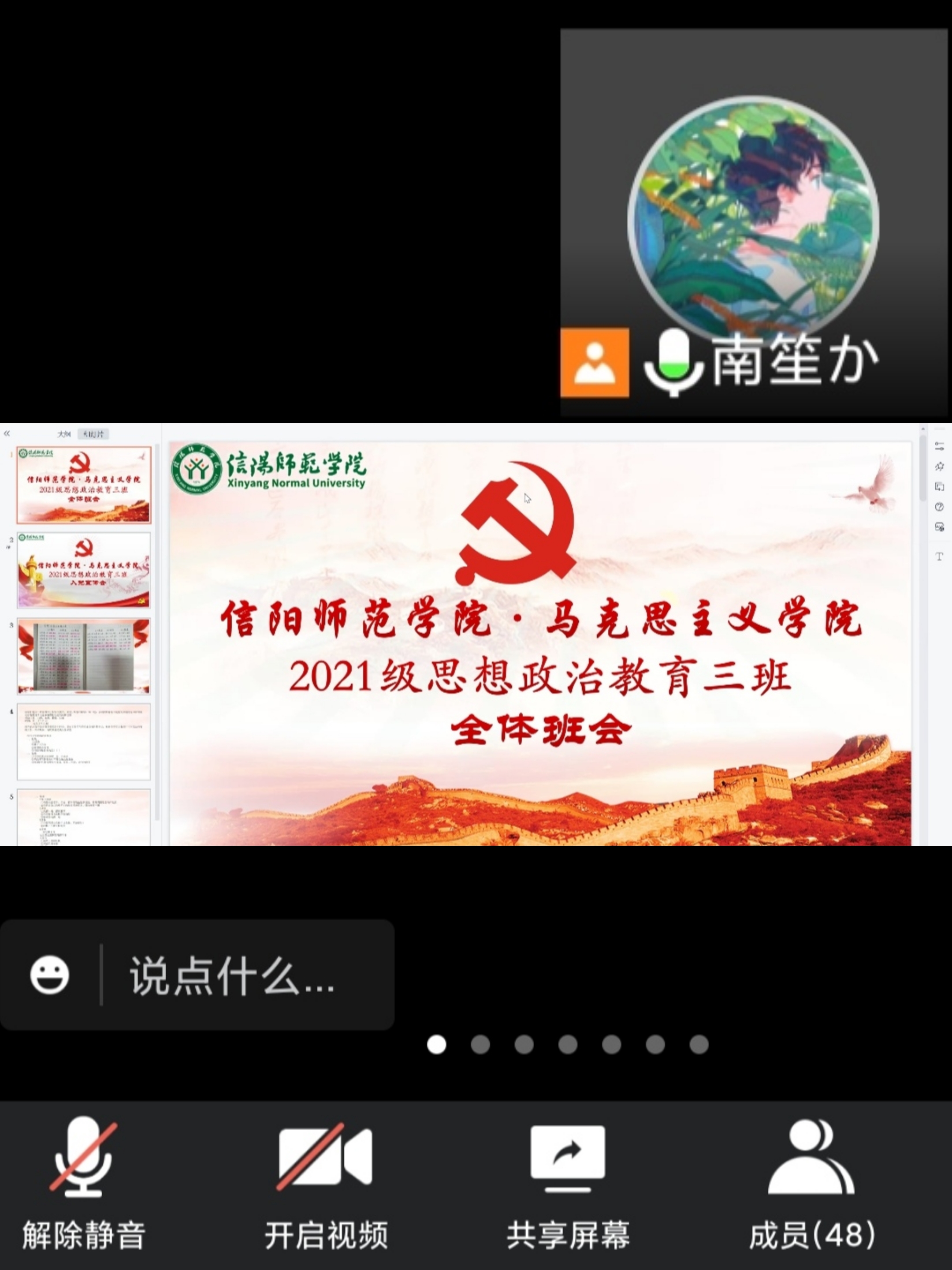 为增强同学们对入党的重视和调动同学们参与班务的积极性,10月14日晚上,77779193永利官网2021级思想政治教育三班入党宣传会暨全体班会在腾讯会议上顺利召开。77779193永利官网2021级思想政治教育三班全体同学共同参加,会议由团支书郭少华和副班长王岚霄主持。