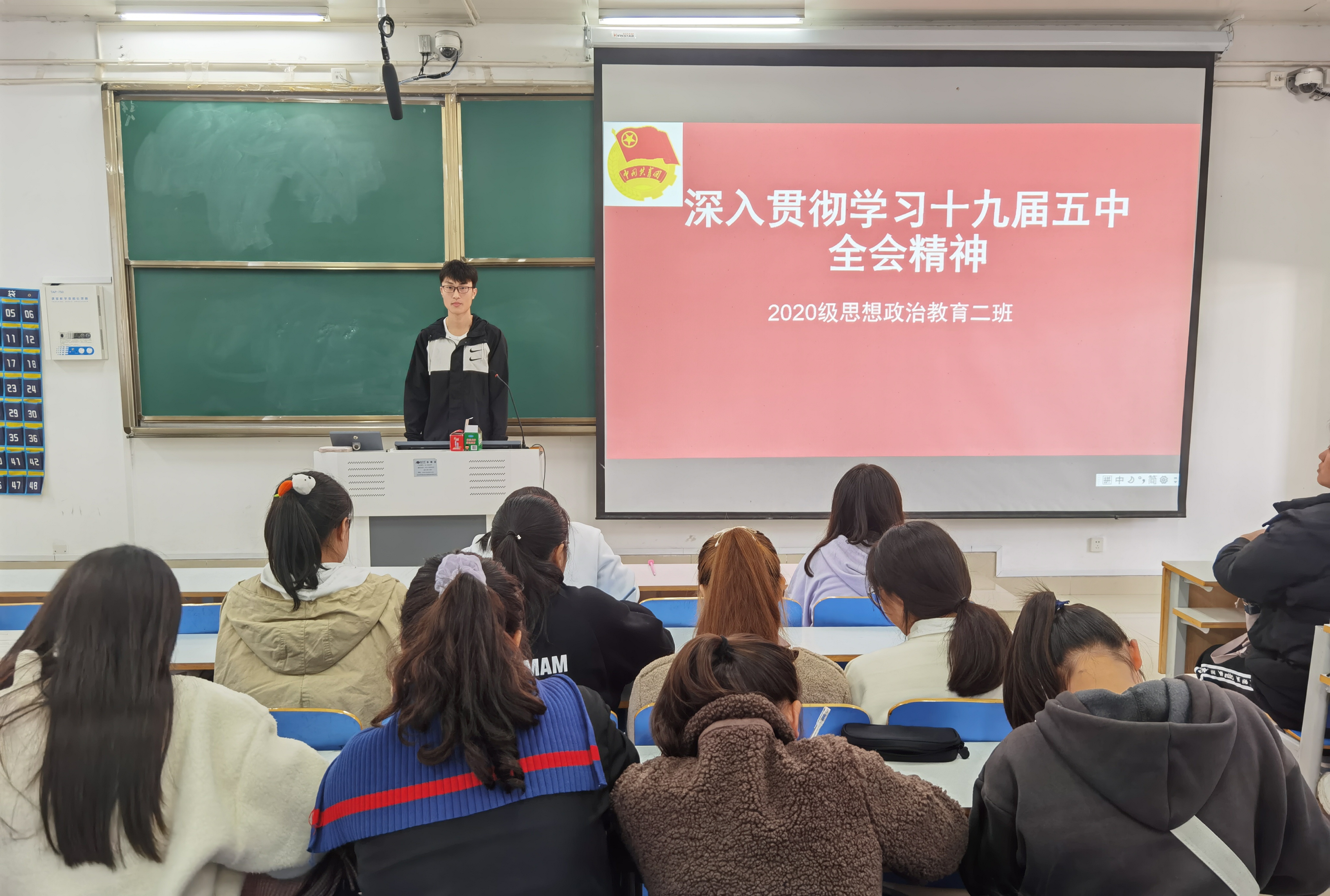 11月19日上午,永利官网2020级思想政治教育二班在社科楼514教室开展学习贯彻十九届五中全会精神团日活动,2020级思想政治教育二班全体学生共同参与本次活动。活动由团支书陈宇航主持。