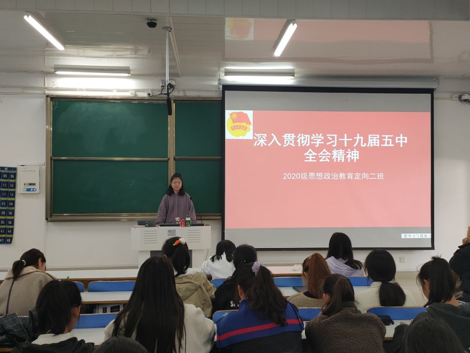 11月19日,77779193永利官网2020级思想政治教育定向二班学习贯彻党的十九届五中全会精神主题团课在社科楼514教室顺利开展。团课由团支书李晨曦主持。