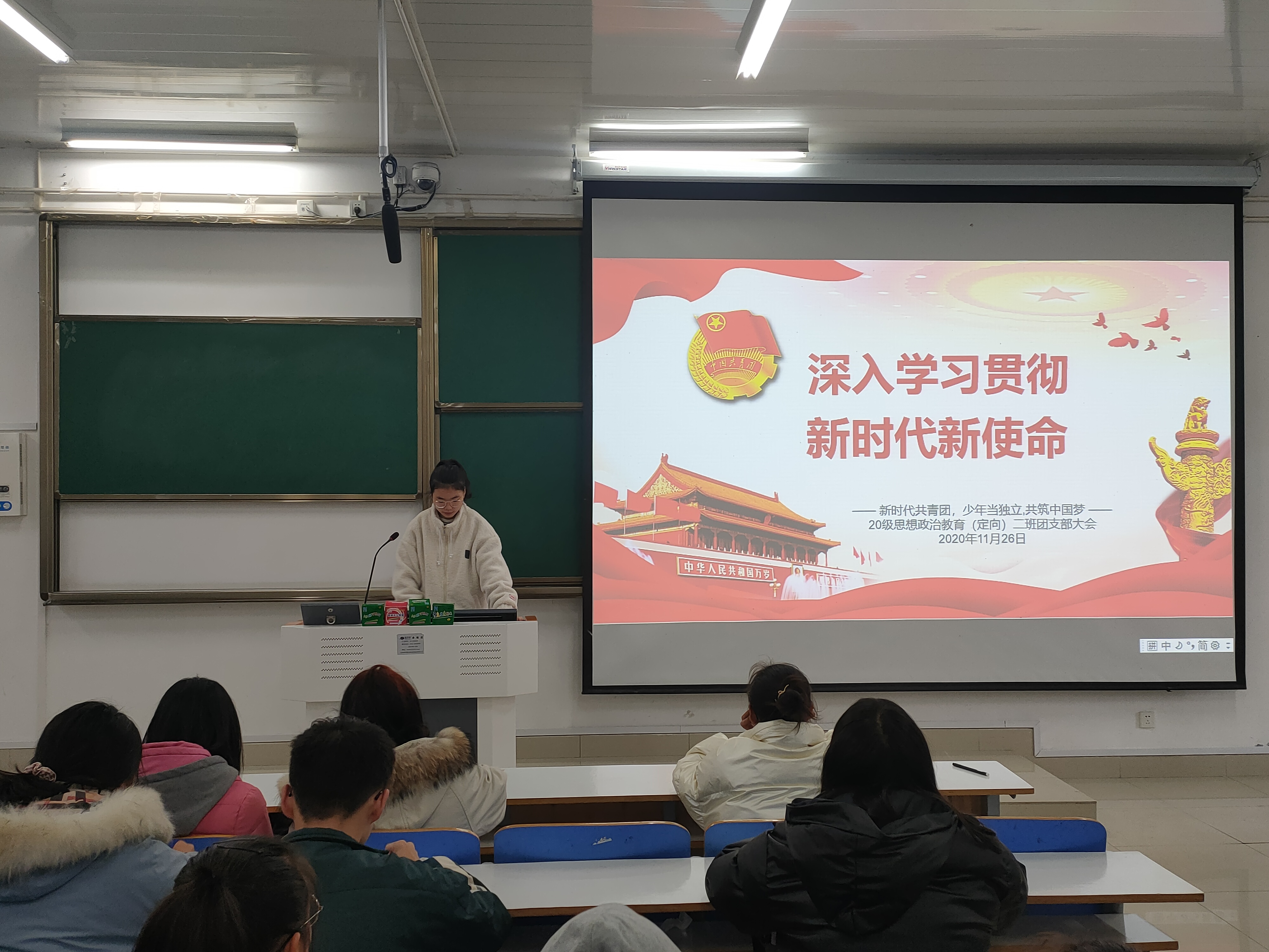 为促进同学们深入学习共青团知识,自觉担当新时代新使命,11月26日,77779193永利官网2020级思想政治教育定向二班“担当新使命,共筑中国梦”主题团支部大会在社科楼514教室顺利召开。定向二班全体团员参与此次会议。大会由团支书李晨曦主持。