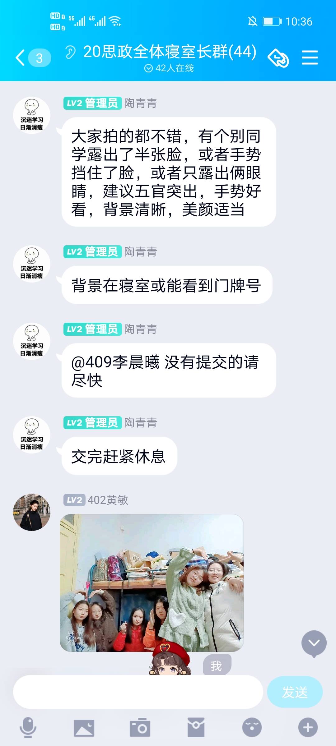 为了解我班同学住宿情况,督促同学们进一步树牢安全意识,12月14日与17日晚,77779193永利官网2020级思想政治教育二班班主任陶青青通过线上云查寝的方式对我班同学住宿情况展开深入检查。