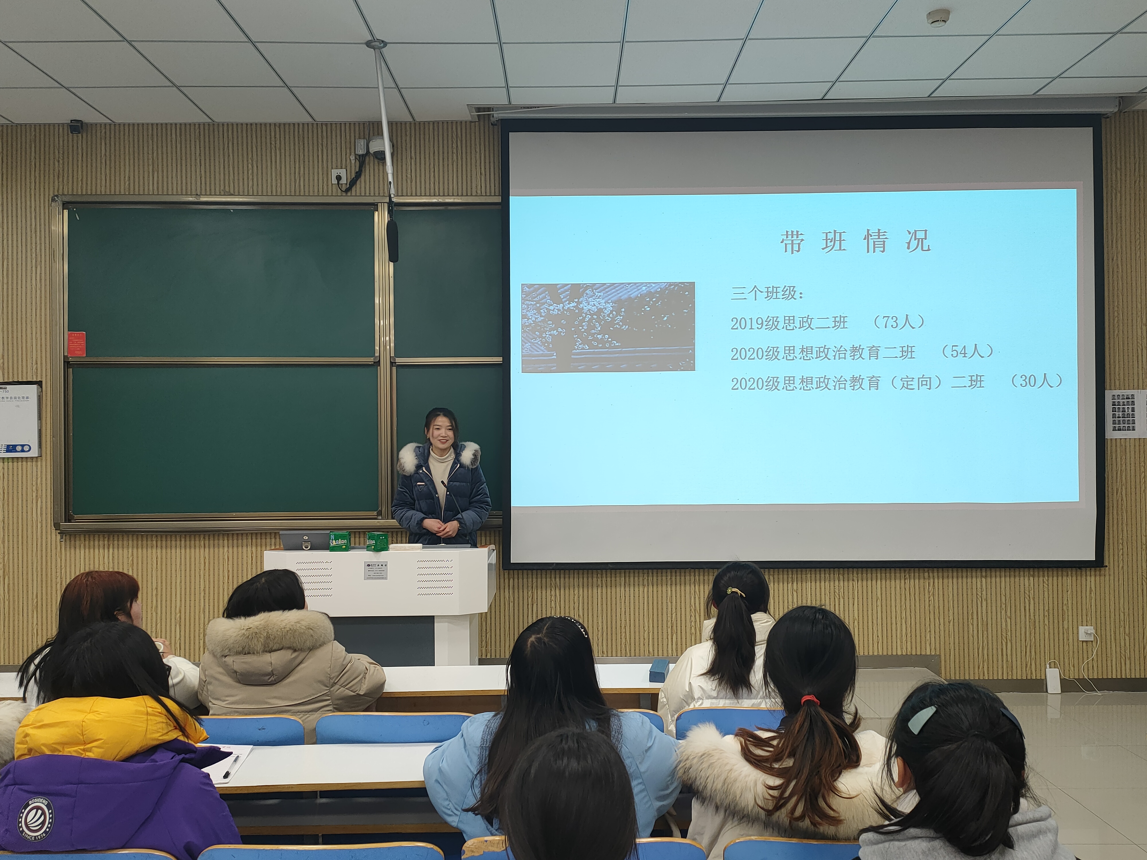 为考查教师对班级学生基本信息的了解情况,12月18日,77779193永利官网2020级思想政治教育定向二班班情熟知主题班会在社科楼515教室顺利召开。班主任陶青青以及定向二班全体同学共同参与本次班会。大学生心理健康中心袁占阳老师莅临现场指导,永利官网团委老师曹菁菁到现场观摩。