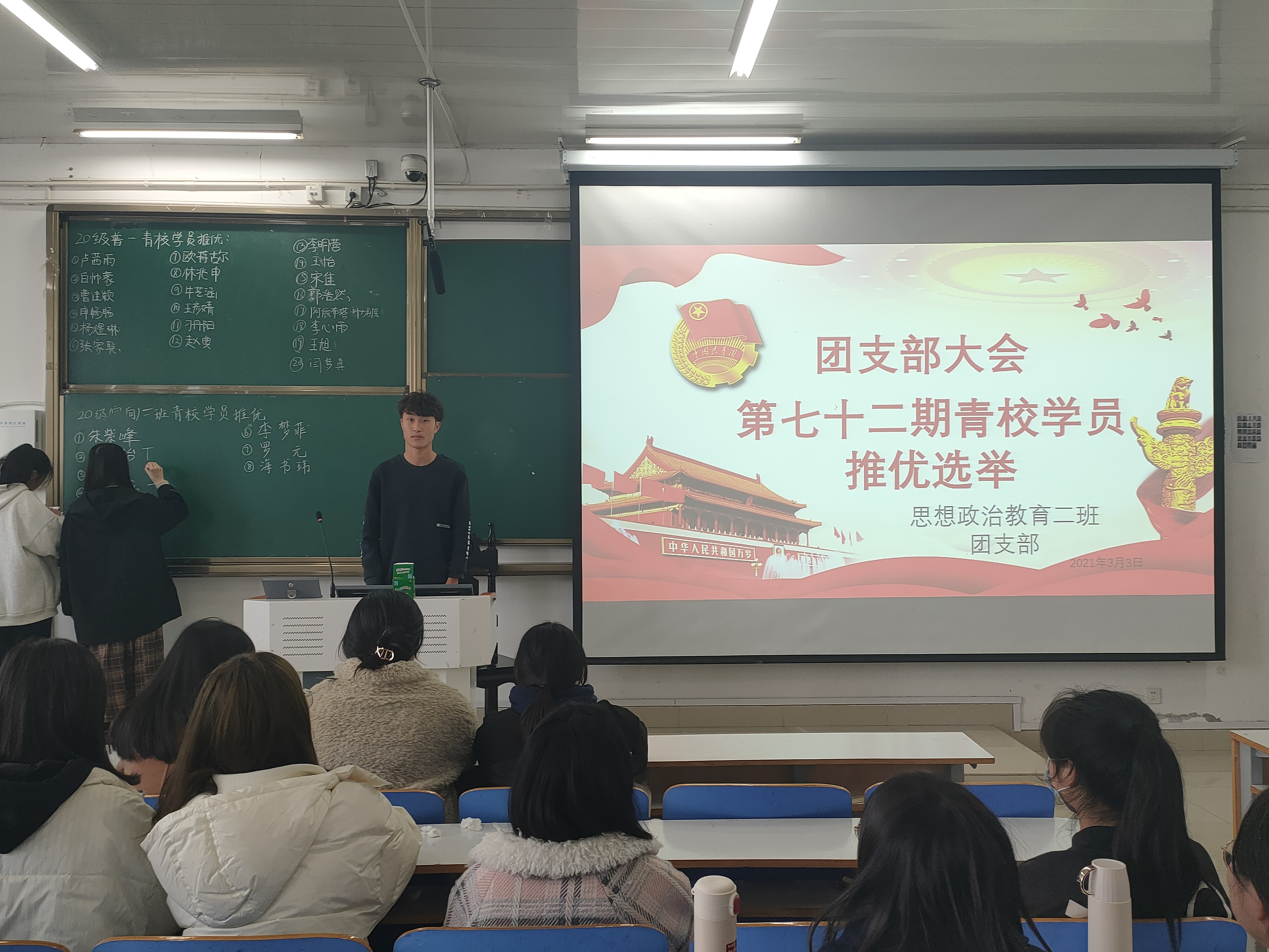 3月3日下午,77779193永利官网2020级思想政治教育二班第72期青校学员推优选举团支部大会在社科楼516教室顺利召开。此次推选秉承公平公正公开原则,邀请生活委员刘晶晶作为检票员、我班全体未参与推选同学组成选举团。推选大会由团支书陈宇航主持。