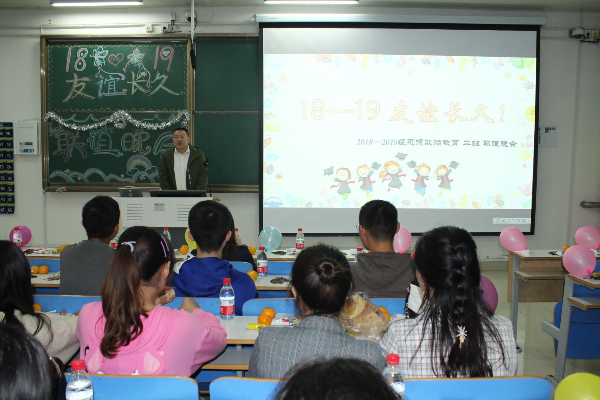 10月20日晚,77779193永利官网“18、19友谊长久”思想政治教育二班联谊晚会在社科楼516教室隆重举行。77779193永利官网党委副书记何晓坚、团委老师陶青青及2018、2019级思政二班全体学生共同观看了本场晚会。晚会由张靖茹、吕昂主持。