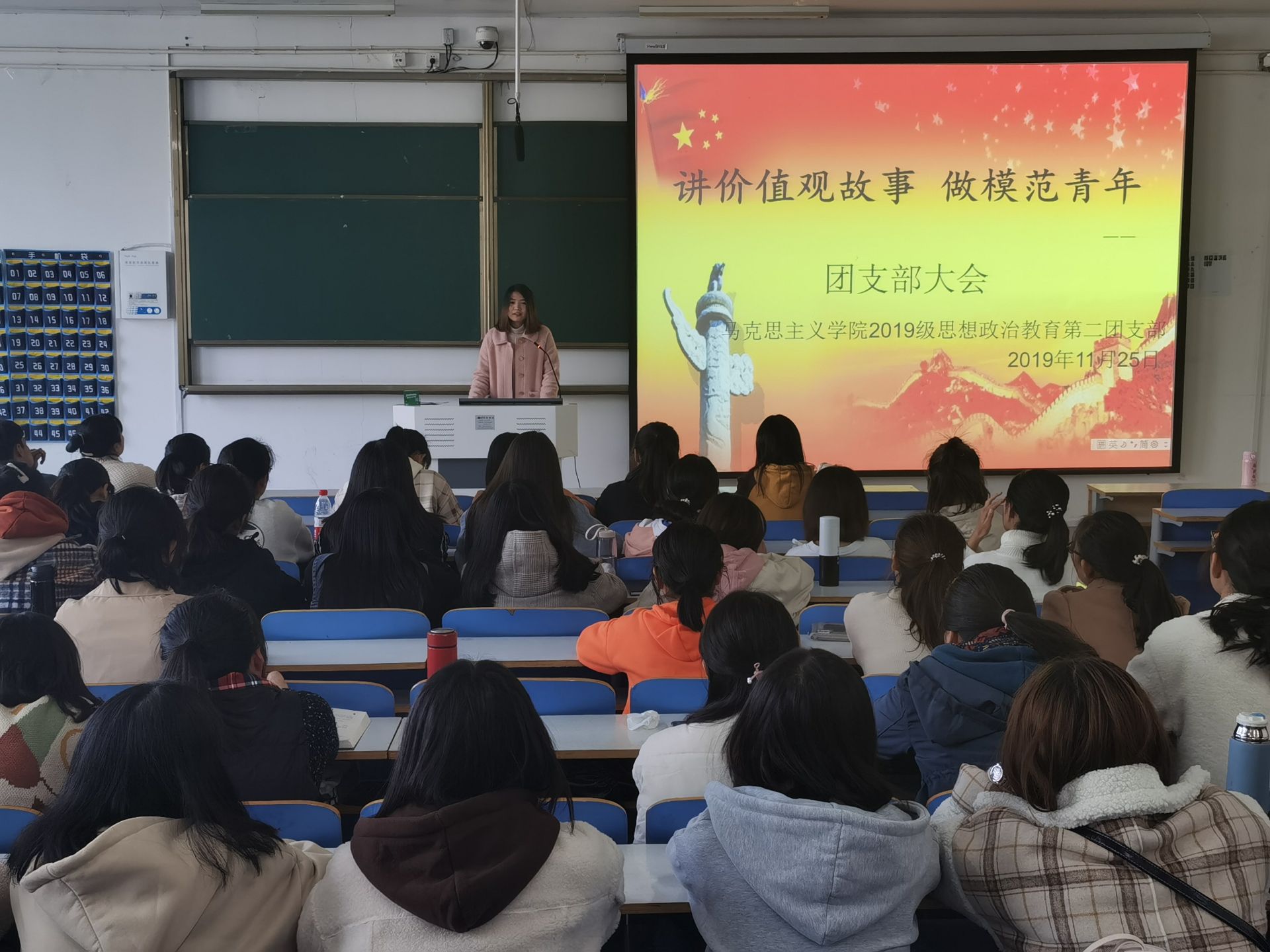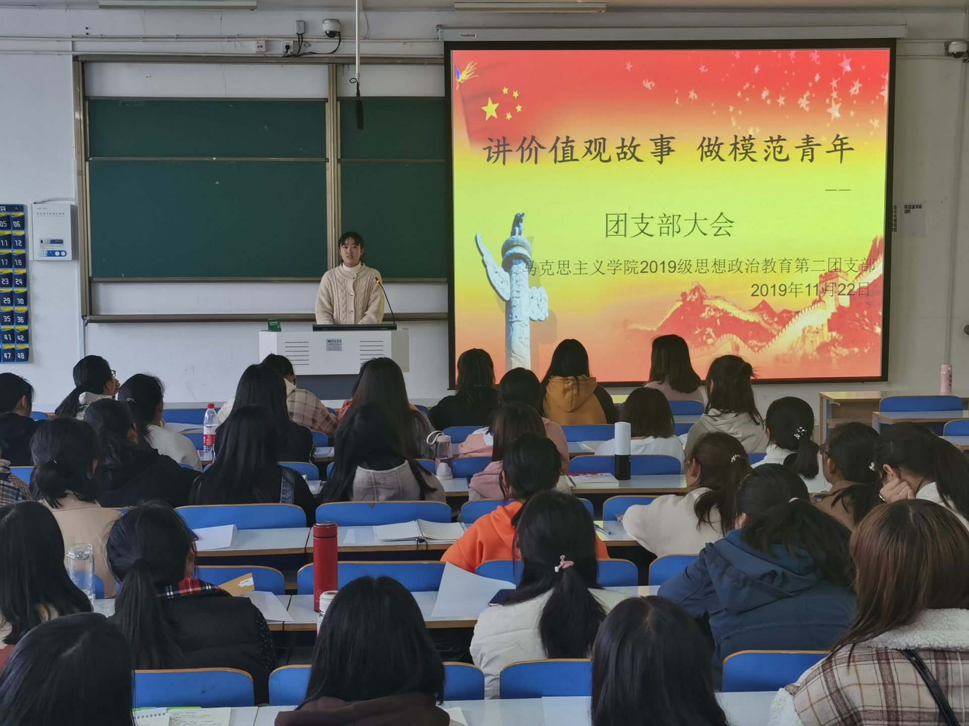 11月22日下午,77779193永利官网2019级思想政治教育第二团支部在社科楼516教室顺利召开“讲价值观故事,做模范青年”团支部大会。团委老师陶青青及77779193永利官网2019级思想政治教育第二团支部全体团员共同参会。会议由团支书孙雅娴主持。