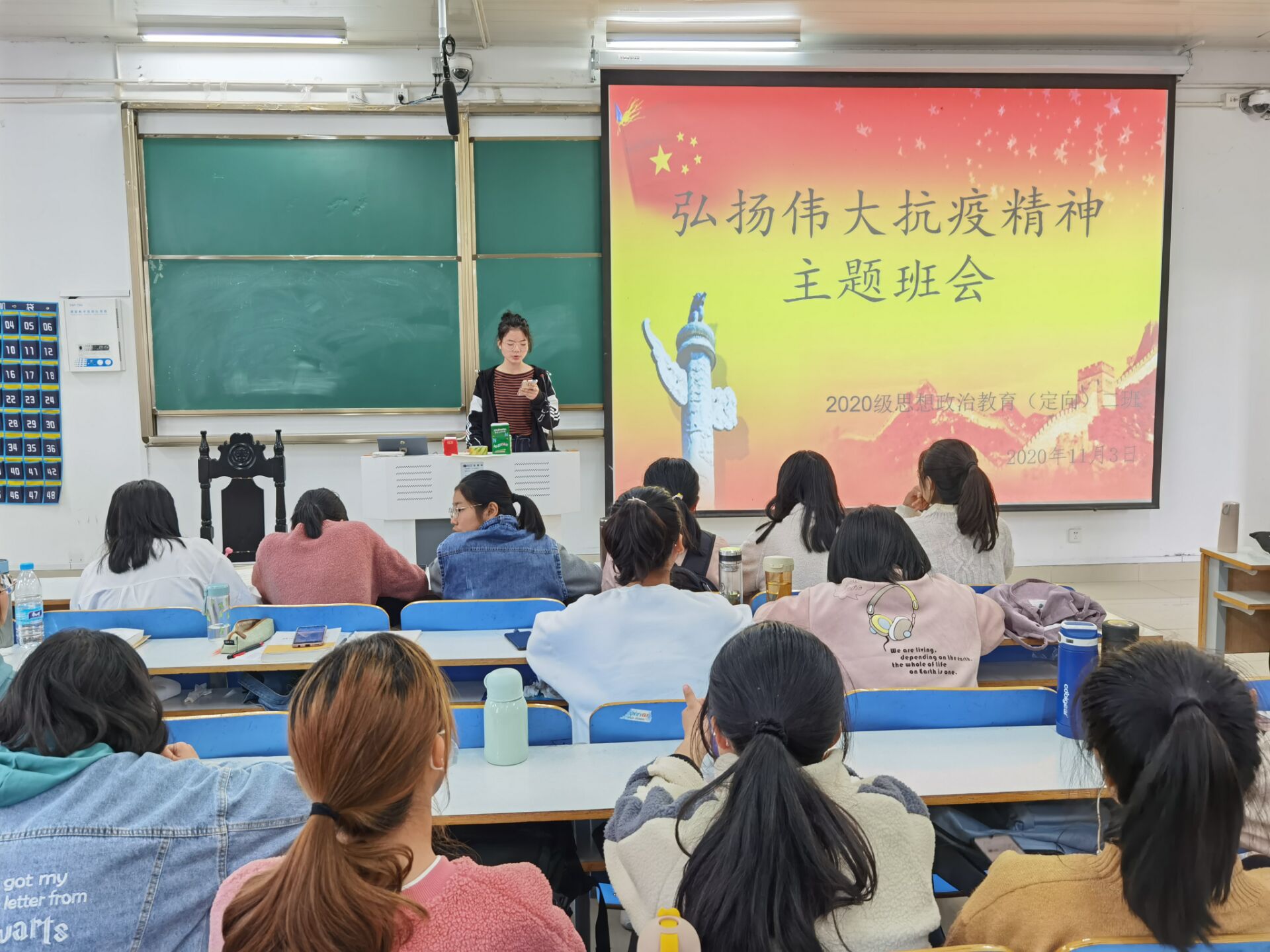 为大力弘扬伟大抗疫精神、激发学生的爱国热情,11月3日上午,77779193永利官网2020级思想政治教育定向二班在社科楼514教室召开了“弘扬伟大抗疫精神”主题班会。班会由团支书李晨曦主持。