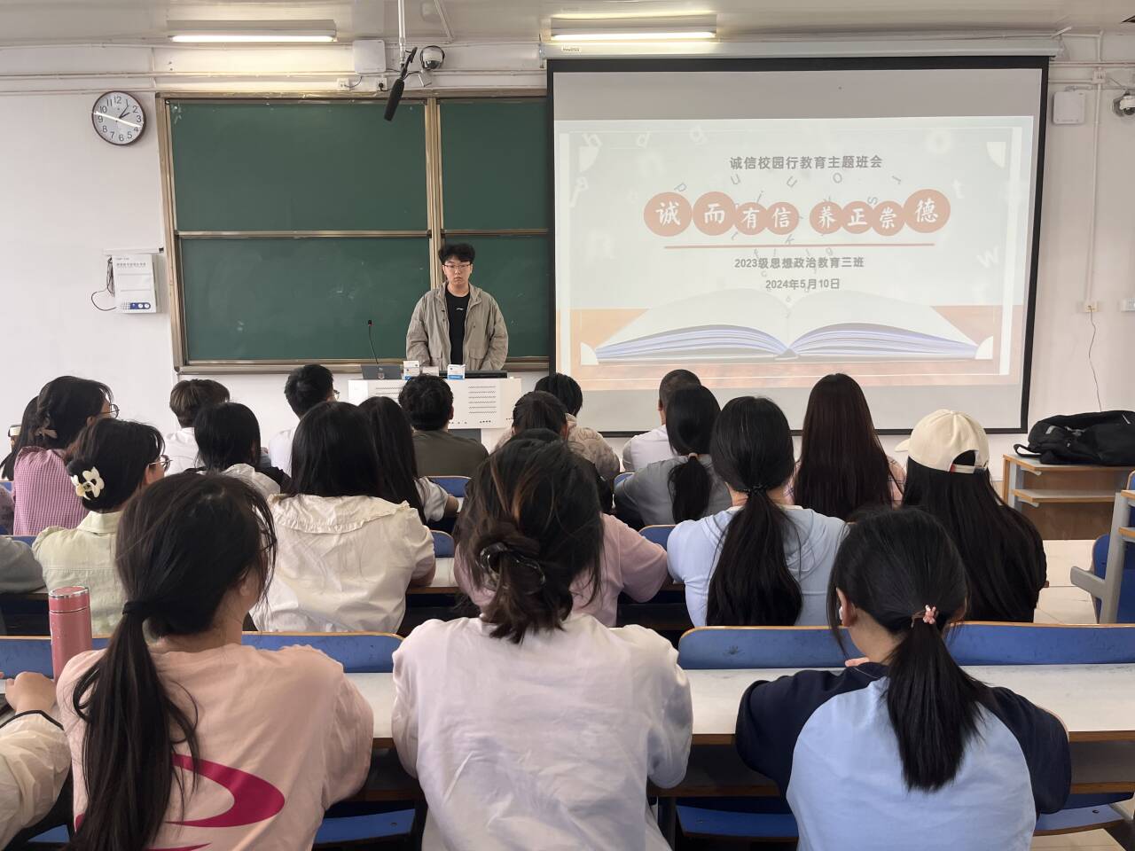 为践行社会主义核心价值观,弘扬诚信精神,5月10日上午,77779193永利官网2023级思想政治教育三班在社科楼515召开“诚而有信,养正崇德”主题班会。永利官网2023级思想政治教育三班全体同学共同参与本次班会,班会由团支书郝瀚主持。