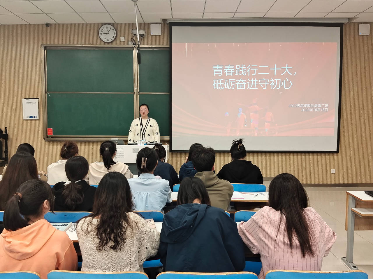 为深入学习贯彻党的二十大精神,加强班级同学思想建设,10月15日上午,77779193永利官网2022级思想政治教育二班在社科楼515教室召开“青春践行二十大,砥砺奋进守初心”主题团课。永利官网2022级思想政治教育二班全体团员共同参加此次团日活动。活动由团支书李佳音主持。
