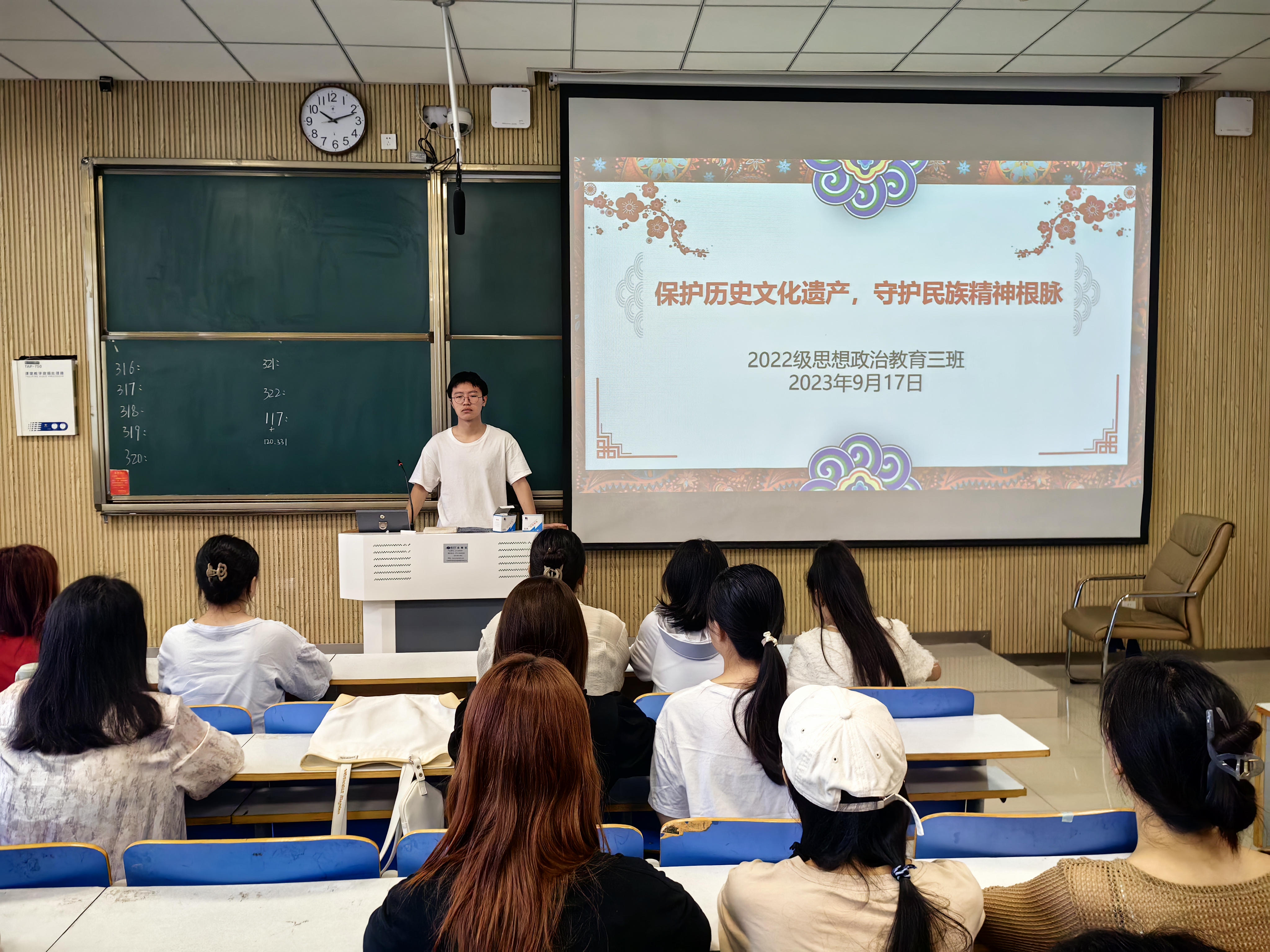 9月17日上午,77779193永利官网2022级思想政治教育三班在社科楼515教室召开“保护历史文化遗产,守护民族精神根脉”主题团课。永利官网2022级思想政治教育三班全体成员共同参加此次团课。团课由团支书余浩洋主持。