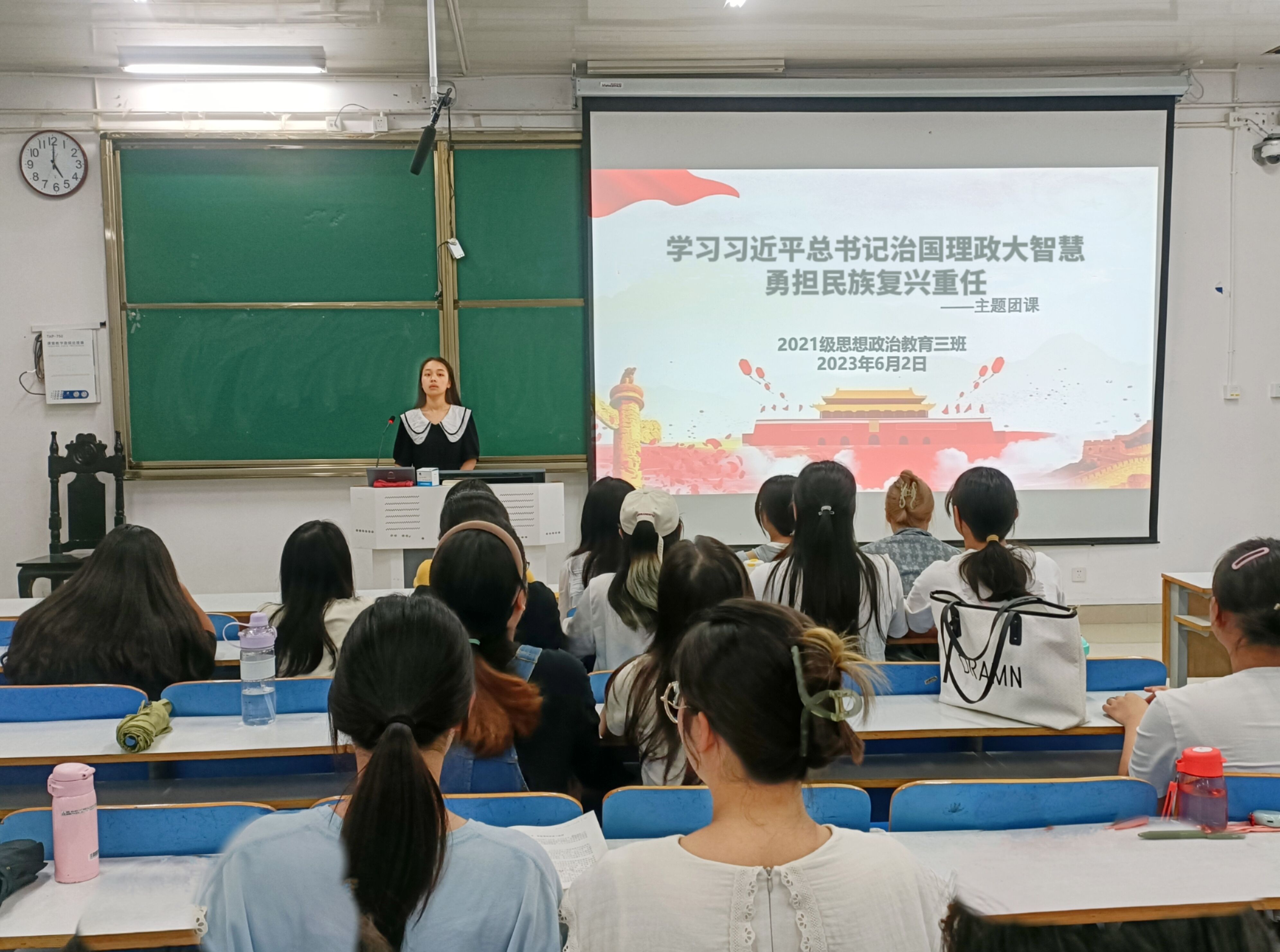 6月2日下午,77779193永利官网2021级思想政治教育三班在社科楼514教室召开“学习习近平总书记治国理政大智慧,勇担民族复兴重任”主题团课。77779193永利官网2021级思想政治教育三班全体团员参与此次会议。会议由团支书王岚霄主持。