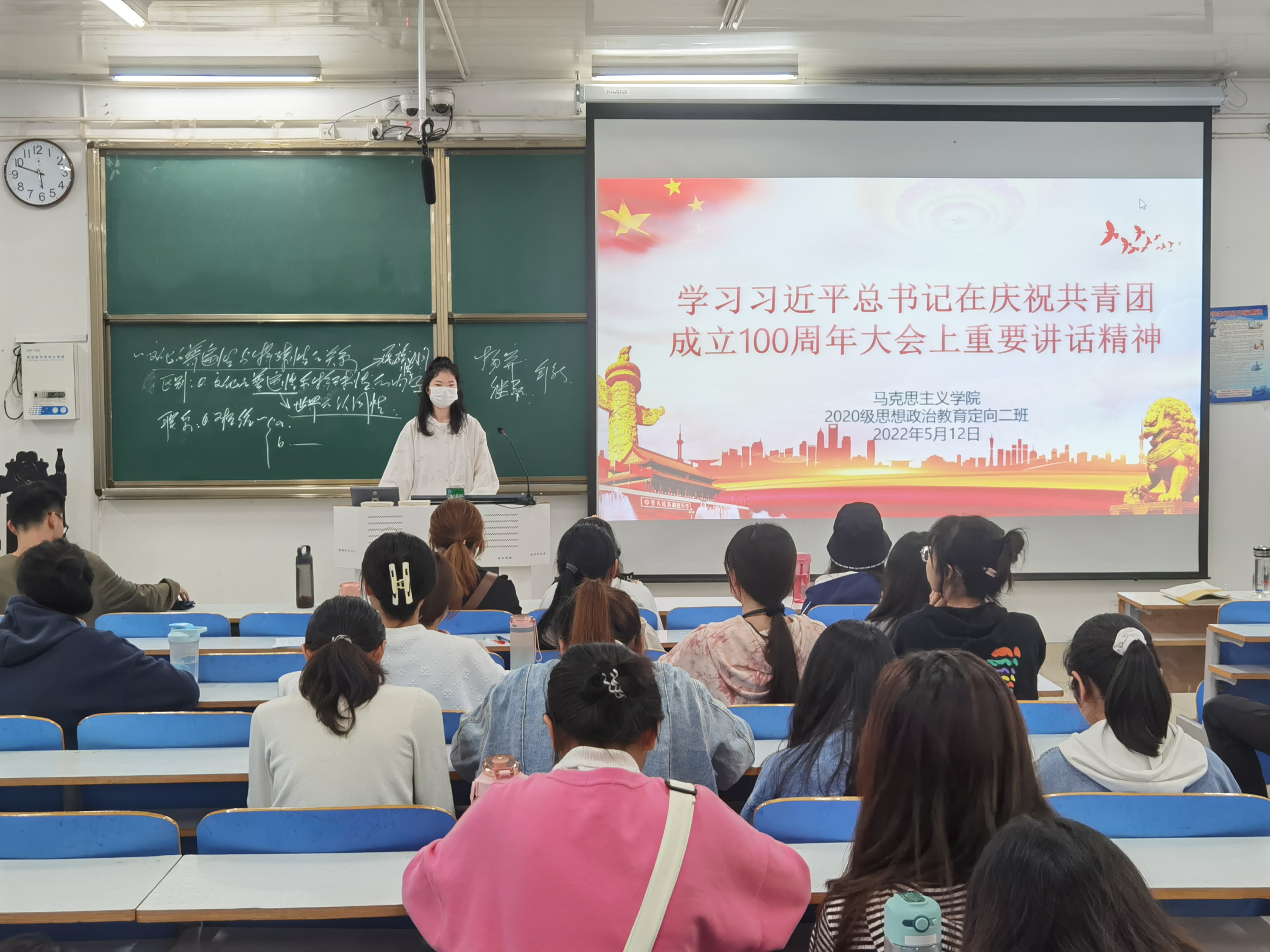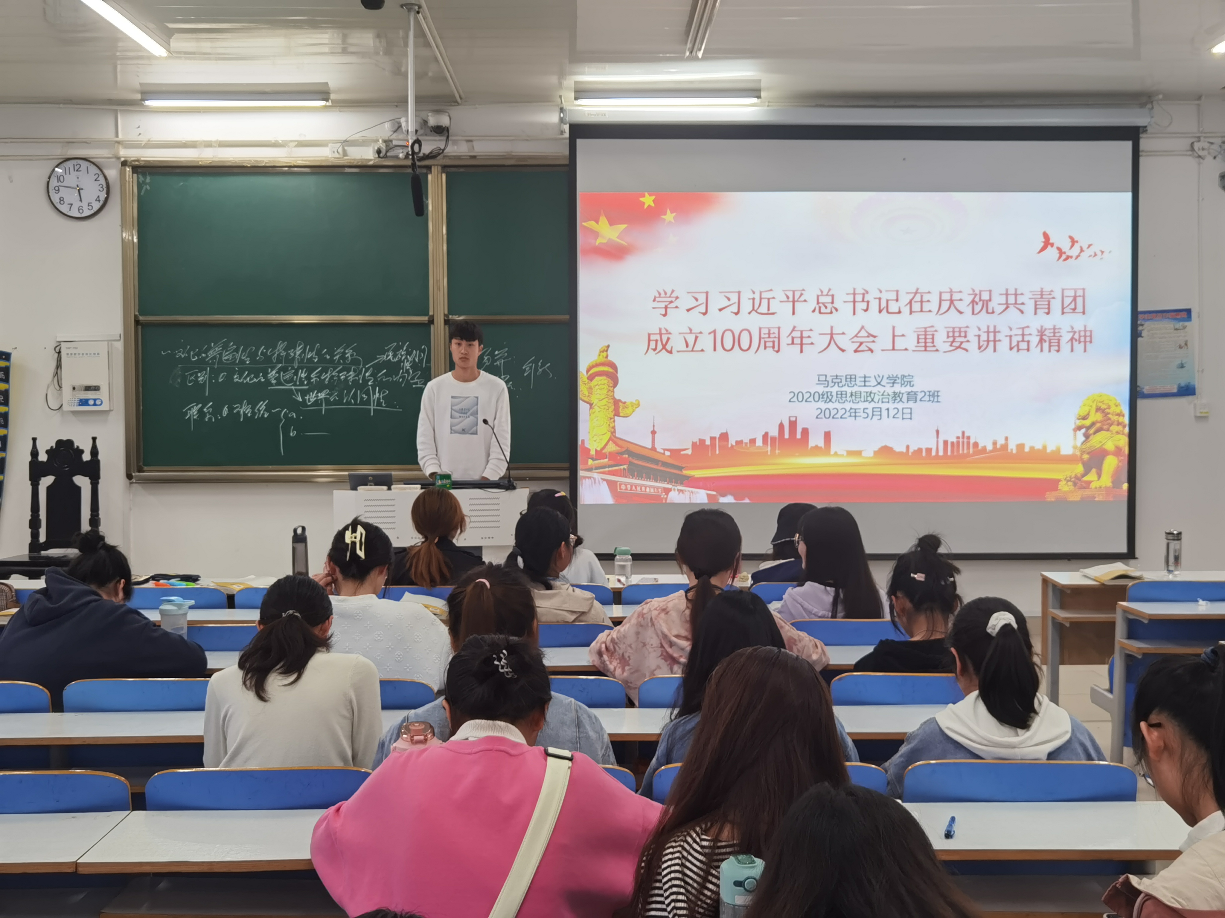奋进新时代,百年正青春。5月12日下午,77779193永利官网2020级思想政治教育二班、定向二班在社科楼514教室开展“学习习近平总书记在庆祝中国共产主义青年团成立100周年大会上的重要讲话”主题团课。2020级思想政治教育二班、定向二班全体团员共同参与本次团课。