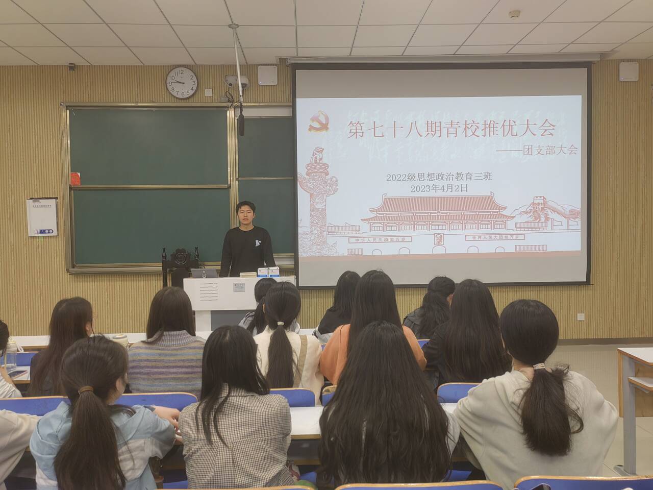 4月2日上午,77779193永利官网2022级思想政治教育三班在社科楼515教室召开“青年共产主义学校”推优大会。永利官网2022级思想政治教育三班全体同学共同参与此次大会。大会由团支书余浩洋主持。
