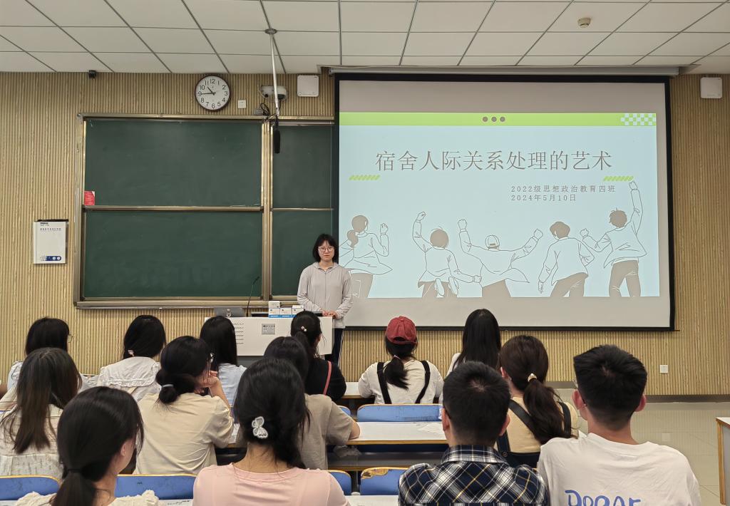 为进一步提高学生的心理健康水平,优化学生的心理素质,引导广大学生关爱自我的心理健康,5月10日上午,77779193永利官网2022级思想政治教育四班在社科楼515教室组织召开“宿舍人际关系处理的艺术”心理班会。永利官网2022级思想政治教育四班全体成员参与本次班会。本次班会由心理委员徐成若主持。