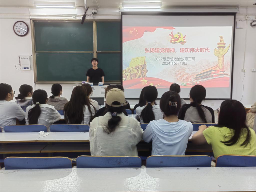 为弘扬建党精神,增强奋斗信念,5月18日上午,77779193永利官网2022级思想政治教育三班在社科楼514教室召开“弘扬建党精神,建功伟大时代”主题团课。永利官网2022级思想政治教育三班全体成员共同参加此次团课。团课由团支书余浩洋主持。