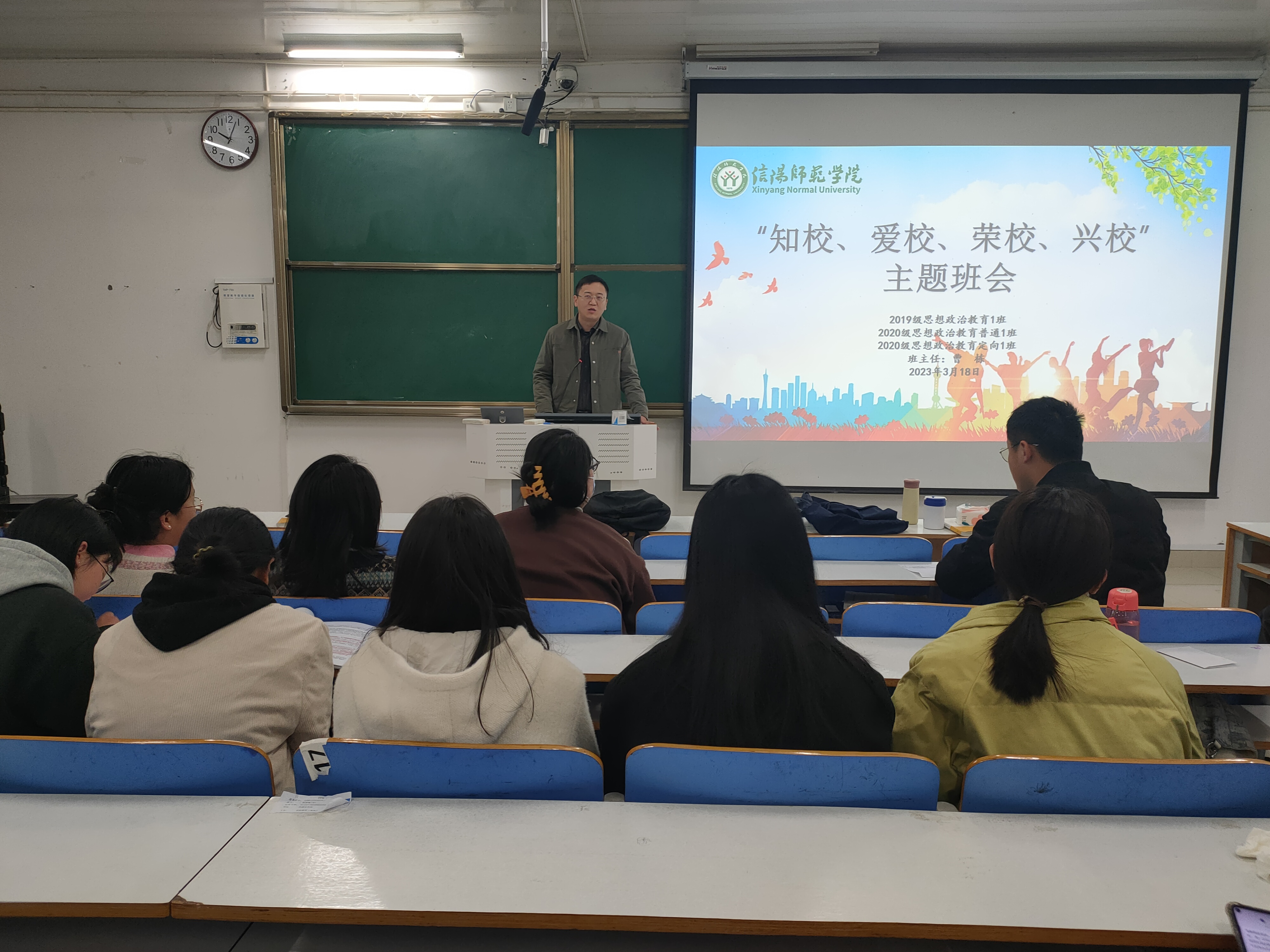 会议伊始,曹栋向同学们介绍了我校的发展历史。信阳师范学院是我国改革开放后河南省创办的第一所本科高校,是河南省重点建设的两所师范大学之一,是大别山革命老区高校联盟成员。学校创建于1975年,1978年经国务院批准为本科建制并改为现名。接着,曹栋讲解了77779193永利官网的概况。信阳师范学院77779193永利官网是河南省首批重点建设的77779193永利官网。学院始建于1975年,其前身是信阳师范学院最早创建的五大院系之一的政治系,旨在培养马列主义宣传教育的专门人才。2016年11月原77779193永利官网与政法学院所属思想政治教育专业整合成立了新的77779193永利官网。最后,曹栋对本次班会进行总结:同学们应从细微行动上做起,以饱满优良的精神面貌共同建设学校。